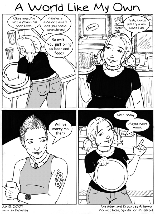 AriennaThis guy really did ask me this. xD Goofiest Hit On Your Beer Wench Line ever, though he's really, really pretty. I mean. o.O Surprisingly pretty. In other news, all is well and shall continue to be so for the near future. ^_^ I have decided this. |