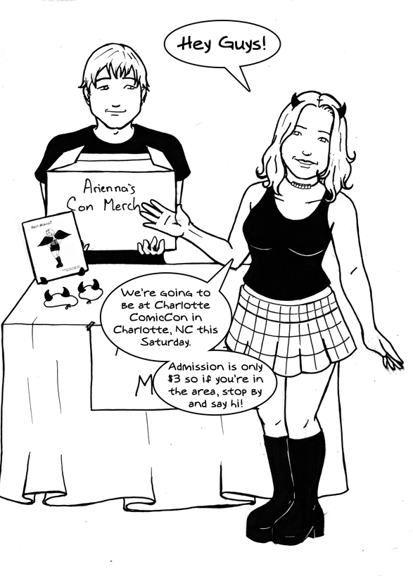 Well! ^_^ Like the comic says, I'm going to be at the Charlotte ComiCon this Saturday with some indy comics and prints and buttons and horns to sell. ^_^ If you're a fan of the comic and ready for your DOOM shirt (or you just wanna come say Hi or threaten Trent with unending Doom should he break my heart...) come on by! ^_^ I'll be real happy to see you.