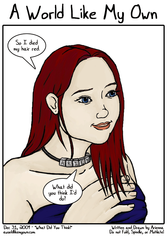 There's a lot of truth to it. Trent and I broke up and I was... In an odd state. I wasn't emotionally devastated but I was raw and hollow. So I sorta retreated back into a more defensible position, threw up some walls and slapped on a coat of paint.. That is, I painted my face and dyed my hair. If you read my journal, there's an entry about my feelings and reactions, immediately after the dye job. I really like it. ^_^ I think it looks pretty spiffy and while I'm always going to think of myself as a short, chubby blonde girl, most people think the red suits me much better than the blonde did.