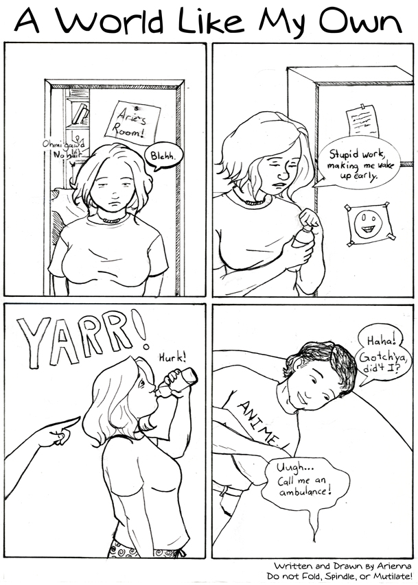 AriennaMuaha! New comic. Tried a couple new things with this one - new pens, lots of white out, tried to letter it by hand. Kinda interesting, not sure how I feel. We'll see. ^_^ |