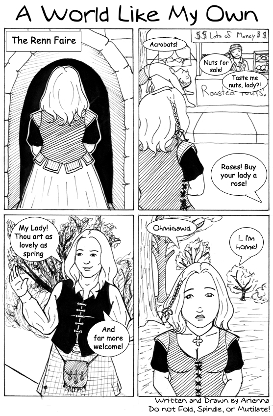 Apparently I had a pressing urge to draw trees when I sat down to do this comic. I've never in my life had an urge to draw trees before and while there were a few in the faire, it's not like it was wild rolling hills of wooded wilderness. But... um. My pen demanded trees and so you all get funny looking ink-sketched trees.