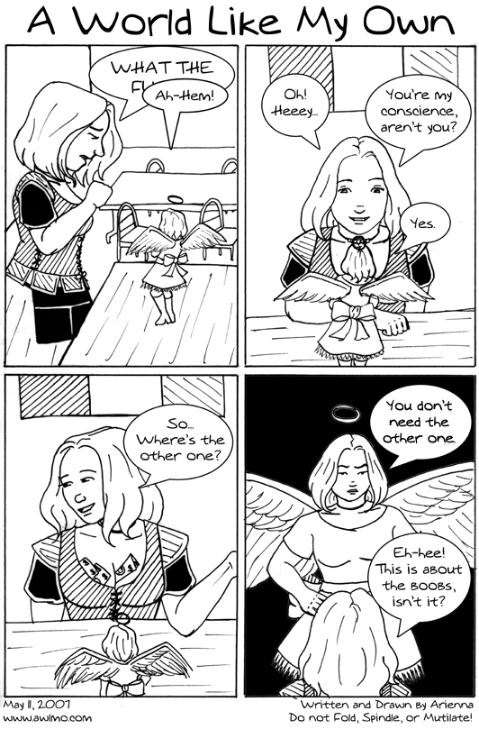 So, the angel girl idea was stolen shamelessly from Jennie of The Devil's Panties. I was going to use Jennie's angel girl but then I thought... heck. Everyone else has personifications of their good and bad sides, why shouldn't I? ^_^ So apparently my conscience is a Sweet Lolita Bitch. I'm as surprised as you are.