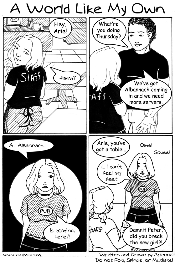 AriennaSee, what'd I tell you? ^_^ Right on time, thanks to Kevin. I actually drew this ages and ages ago when the really cool band Albannach came to the pub. If you haven't heard of them, chase the link and click into their radio section - they do a 24 hour streaming broadcast of their work. Not only is their music AMAZING, but each member of the band is drop dead gorgeous. Rawr. Every thing's going to be okay. |
