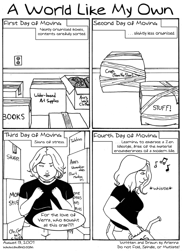 This is... very nearly what moving is like for me. I start out with carefully sorted boxes, each well labeled and organized by room, use, and importance. Then... I start just piling things into boxes by how they fit. Then I start swearing at my possessions and wondering where the hell the more esoteric pieces came from. Then I start throwing things away... And then, inevitably, there comes the gasoline can and the matches.