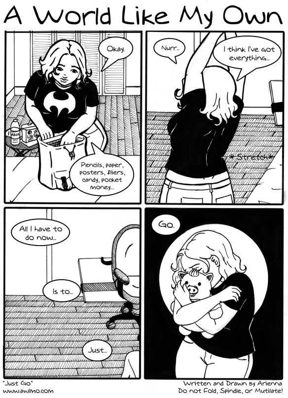 In other news, because we're getting really close.. if we're in the top 50 on the webcomics list (go vote!) next week, there will be a fourth update... probably on Sundays. Also in the interests of moving forward with the comic, going to conventions, eventually taking over the world... Is anyone interested in AWLMO merchandise? Books, posters, t-shirts, buttons? If so, what sort of thing would you be interested in buying? Any feedback is welcome. See y'all Friday!
