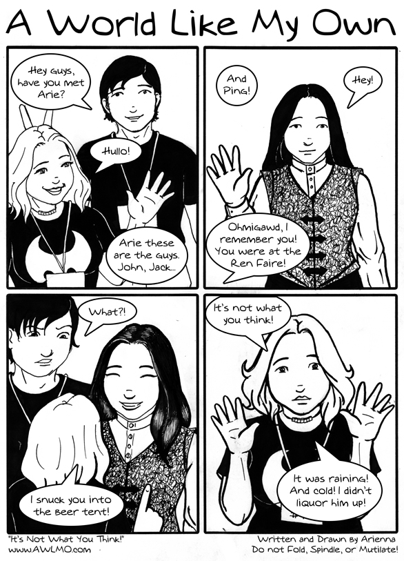 First off I want to say I didn't -really- sneak him into the beer tent. If you all recall, I was the only Beer Wench in the entire Faire (such an exalted position to hold... Better than being Queen by -far-). It was got rainy and chilly several times that month and so the Pub was a happening place to be. It had a roof, four walls, the only alcohol officially on site, and the best musicians in town. It got very crowded. At one point I looked outside and there was this utterly beautiful flower of a pretty Asian boy with Amazing Hair standing outside. So I took a brief break and wandered out to tell him to come -in- the Pub, not stand in the rain outside it. He explained he couldn't, he was nineteen. So I pulled him over to the sheriff who was doing the carding and asked if I promised not to give the boy any booze, could he please come in.