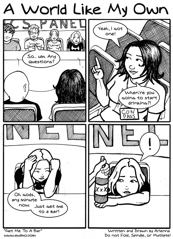 Also, this is such a true story. :D And the people on the panel with me (there were a million people on that panel) are some of the people from The North Carolina Webcomics Coffee Clatch. These people are almost entirely responsible for my newly developed urge and ability to update the comic regularly and on time. ^_^ Check out the site and click all their comics - these are some really cool people.