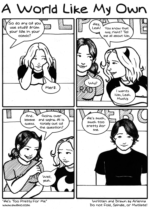 AriennaWoot, comic! The lovely young lady in this comic strip is Leah of Willrad. She's even more talented than she is lovely and just as friendly. Leah let me lean on her while I drooled all weekend, as well as letting me hang out at her table in Artist's Alley! Thanks, Leah! :D Everyone go check out her stuff - she has a lot of prints and t-shirts that're seriously very cool. |