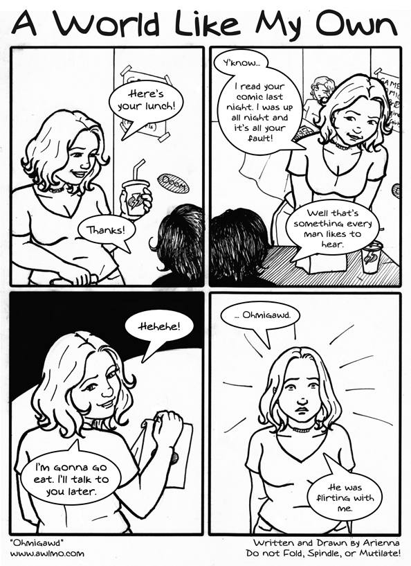 Well. Well, well. 200 comics. It's been an interesting journey, hasn't it? A lot of things have happened since I first started drawing this as a joke to entertain my roommate. I think it's safe to say that now-a-days my whole life centers around this comic. I work so I can come home and draw. Every day things happen and I take mental notes saying, "That'll make a funny comic..." AWLMO is the most important thing about myself I always want to share with other people. "What do you do?" they ask. "Well, I'm an artist! I draw an online comic about my life!" I love drawing this comic and I want to keep drawing and getting better at drawing it and telling stories for a long time. AWLMO isn't about telling silly stories to amuse my roommate anymore. This is me. When you visit AWLMO and read the comics, I'm throwing open the doors and inviting you into my life. These are my stories, these are who I am. It's a little funny, a little sad, and utterly true.