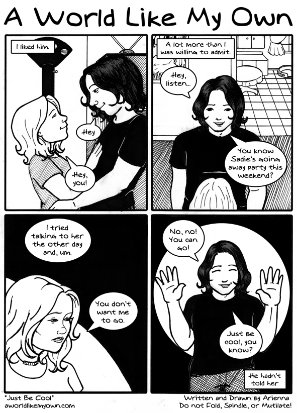 So in site news... I've changed my ads over to some click-through paying ads and I have really high hopes for generating revenue off of them. I sat down with a calculator and realized that if AWLMO made me $10 a day reliably, I could work weekends only at my day job without dying of starvation. With that much free time, AWLMO would get updated regularly, I could redraw the archives (And thus, get a compilation book printed by lulu.com, omg), I could start practicing colouring again, I could pick up a secondary project (like A Naughty World Like My Own. Or A Larp Like My Own. Or A Podcast Like My Own)... There's just no end to the things I could do. o_O It sort of boggled my mind. $10 a day and I could completely change my life.