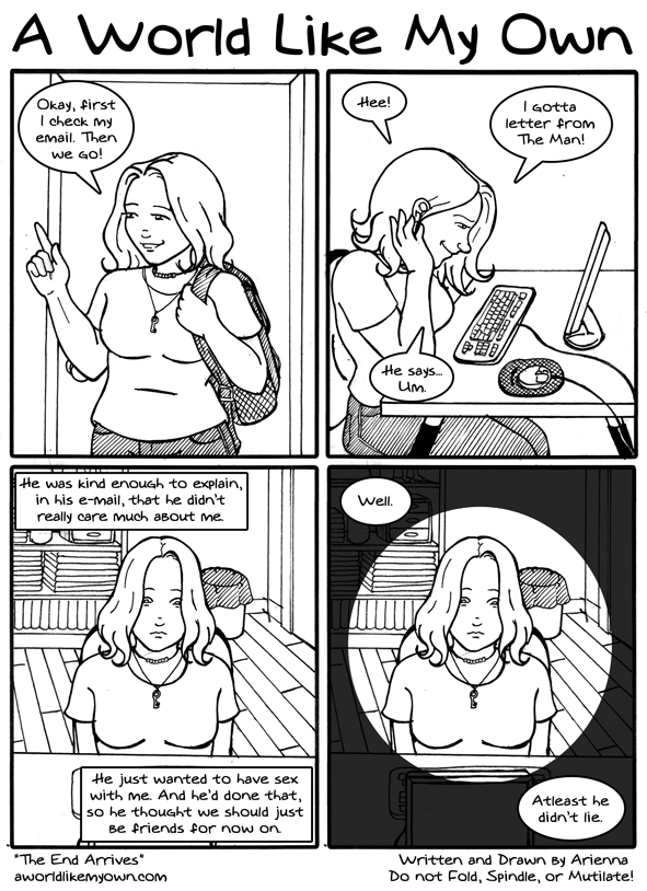 Anyway. Anyway. It's over now. Finally. It's time to move on to things that are, if not bigger and better, at least -different-. There's all sorts of big stuff on the horizon, boys and girls, enough to keep me busy for years. Four years and ten months, atleast. Thank you for sticking with me through this digital penance, with all the distractions, filler, and drama. Thank you, so much. Y'all rock my socks off. For realz, yo. ^_~ I want to promise to be better, to not miss any updates, to cut down on the filler... But I try not to make promises I can't keep. Stick with me and I'll tell you my stories in my own wandering ways, I promise.