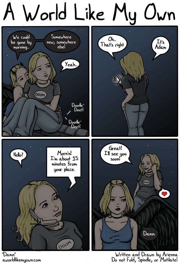 AriennaNew comic. ^_^ I'm really pleased with how the wings in panel 4 turned out... And with how quick this comic was - I scanned the inks on Monday and by the end of Tuesday night, I had the comic coloured and lettered. Picking up steam again! ^_^ |