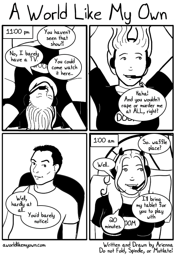 AriennaThis is a completely true story and serves as embarrassing proof of how poor my self-preservation skills are. Also, strangers have the BEST candy! But, really. We talked for hours and then met at a tiny all night waffle place in between us. Where we ate some very questionable waffles and talked some more. While I played with his tablet. Oh yes. ^_~ |