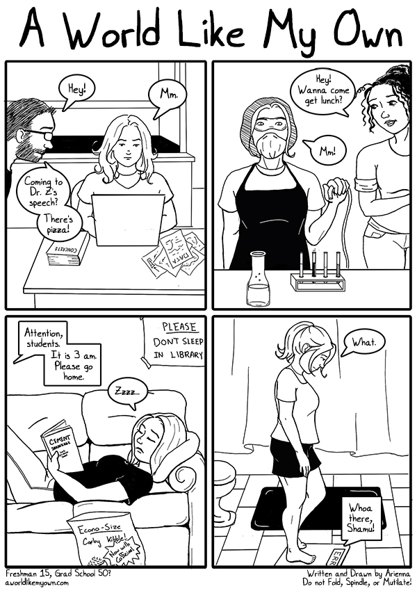 AriennaThis is a little closer to the truth than I would like! ^_^; Every event here at school seems to involve food. 'Hey come be a mentor to freshmen engineering students - there will be pizza!' 'Hey, the lab's having a cook out tomorrow' 'Hey, EngineeringCompany is handing out food and swag at M Hall, make sure to drop by.' I suspect they may be fattening me up for some future Soylent Green situation... |