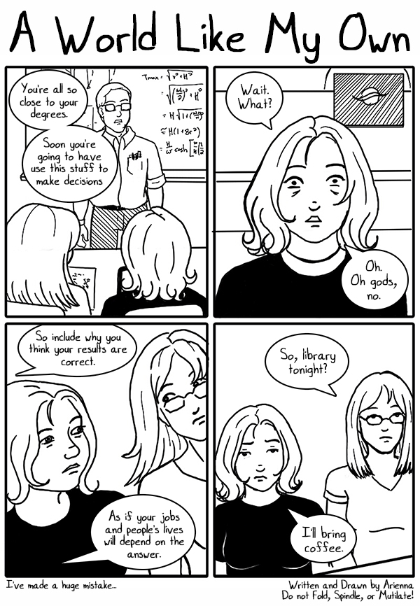 AriennaMy structural engineering professors have been gentle warning us of this since the beginning of the program, but this semester marks the start of my last year of classes and... whoa. The realization that I'm going to have to go out in the world and start working in my profession snuck up and walloped me. Good thing we're expected to work under a licensed professional for a few years. :D |