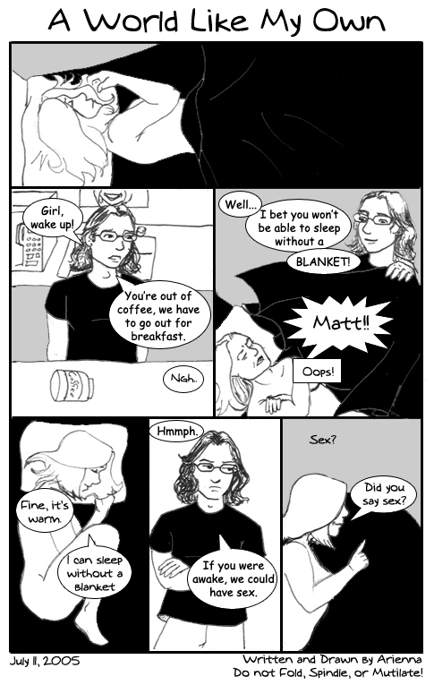 AriennaI tried a couple new things with today's comic (the girl is me, by the by - got my hair cut to confuse you all!! Muahahaha!) the most noticable being a more dynamic layout. I'm not promising that -every- comic is going to be like this... But some of them, now and then. :) They're harder to draw and they take much, much longer.