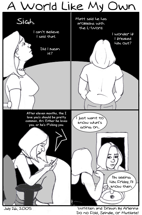 I'm embarressed to post the next few comics. In fitting with the beginning of the end of my first longterm relationship, I've been having a rough time dealing with it. My first couple days of panic and confusion were especially pathetic. ^_^;; In a big way, I don't want Matt to see these, for fear he will think even worse of me... But this comic's gotten to be very important to me, and when someone sends me an e-mail, telling me how the underlying sincerity of my work affects them... well, I'm even more ashamed of my urge to censor my true feelings. So, you all get to experience the highs and the lows with me, from now until one of us grows tired of this. *kiss* 's all I've got to offer.