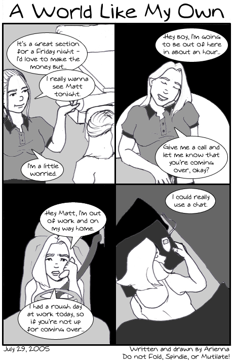 There! The promised comic, up before I've eaten lunch (for those of you who read the forums). This one's really difficult for me to post. I had a very rough couple of days - more due to the -shock- of it all than anything else. I was reeling with hurt and surprise. But I'm going to be okay and since I'm aware of that now, I'm horrified by my origional broken feelings. >_<