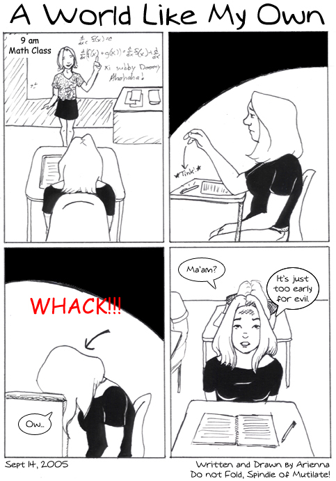 AriennaA new comic - woot, back to school. Not as well drawn as Monday's, but I have -three- bloody tests this week, so be grateful for what you get. :P |