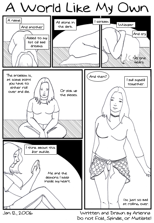 Oy. Most annoying comic, -ever-. I ran out of the old paper (or, rather, the comic boarding...) I used to use to draw the comics on and so I went to buy a whole stack of the stuff. Only, I accidently bought the boards that are shiny on both sides instead of shiny on one side and matte on the other. >_> Shiny will not take pencil well or ink at -all-. Cursesss. So I've got lots of watercolour sketchpads and stuff, right? So what if they're -big-. I'll take advantage of this situation and -expand- the comic. Hah! Yes! A more fluid format. More suited to my growing skills as a visual story-teller... Or something.
